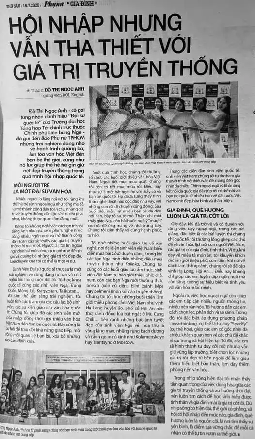 Với cô, việc giữ gìn và quảng bá bản sắc dân tộc không hề mâu thuẫn với khát vọng hội nhập quốc tế. Ngược lại, chính tiếng Nga, tiếng Anh hay bất kỳ ngoại ngữ nào khác sẽ càng trở nên có giá trị nếu người học biết sử dụng chúng như những chiếc cầu nối, giúp lan tỏa vẻ đẹp văn hóa Việt tới bạn bè thế giới.