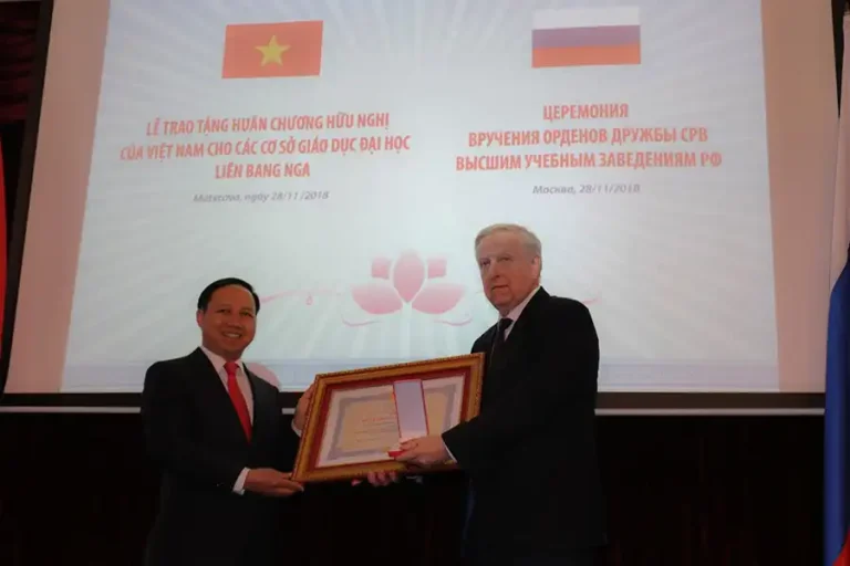 Sáng 28/11/2018 tại Moskva, Đại sứ quán Việt Nam tại Liên bang Nga đã tổ chức Lễ trao Huân chương Hữu nghị của Nhà nước Cộng hòa xã hội chủ nghĩa Việt Nam cho ba trường đại học hàng đầu của Nga nhằm ghi nhận những đóng góp quan trọng trong đào tạo sinh viên, cán bộ cho Việt Nam. Tham dự buổi lễ có Đại sứ đặc mệnh toàn quyền Việt Nam tại LB Nga Ngô Đức Mạnh, đại diện Bộ Ngoại giao Nga, Bộ Khoa học và Giáo dục Đại học Liên bang Nga, cùng lãnh đạo của các trường đại học được vinh danh. Học Viện Kinh tế Quốc gia và Hành chính công trực thuộc Tổng thống Trong danh sách được trao Huân chương Hữu nghị lần này, Học viện Kinh tế quốc gia và Hành chính công trực thuộc Tổng thống Liên bang Nga là…